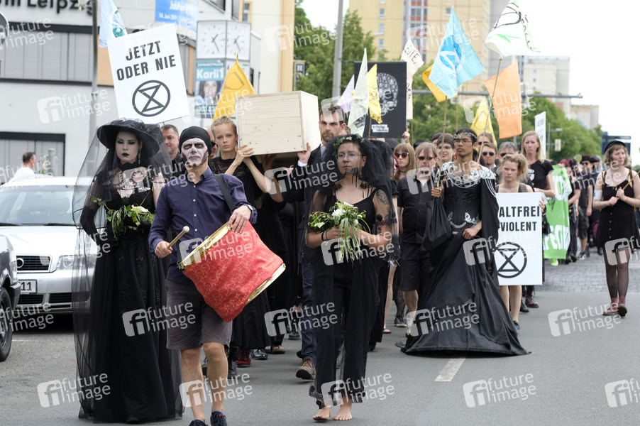 Besucher des 28. Wave-Gotik-Treffens und Klimaaktivisten der Klimaschutzbewegung Extinction Rebellion bei einem gemeinsamen Trauermarsch für aussterbende Arten mit anschliessenden Die-In. Leipzig, 10.06.2019