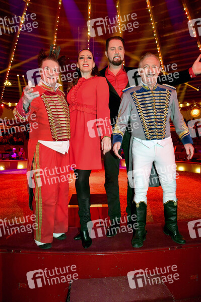 Martin Lacey jr. und Jana Mandana Lacey-Krone mit den Clowns Fumagalli und Daris bei der Premiere der Circus Krone Winterspielzeit mit dem Programm 'Ich.Du.Wir.Krone' im Circus Krone Bau. München, 25.12.2025