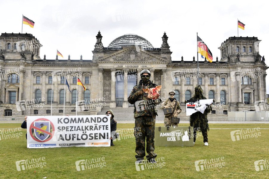 Protestaktion zur Sondersitzung des Verteidigungsausschusses des Bundestags zu den Vorfällen bei den Kommando Spezialkräften (KSK) der Bundeswehr vor dem Reichstagsgebäude. Bei der Aktion führen drei als KSK-Soldaten in voller Tarnmontur gekleidete Aktivisten vor der Kulisse des Bundestagsgebäudes die letzten Skandale der Bundeswehr-Einheit vor: Einer hält einen (künstlichen) blutverschmierten Schweinekopf in Händen, ein anderer zeigt rechtsextreme Symbolik und der dritte trägt Munitionskisten und Munition. Damit sollen die skandalträchtigen 'Partys' einiger KSK-Soldaten (bei denen reale Schweineköpfe verwendet wurden), die rechtsextremen Vorfälle in der Einheit sowie den Munitionsklau symbolisiert werden. Weiterhin wird ein Transparent mit der Aufschrift 'Kommando Spezialkräfte Auflösen' mit dem durchgestrichenen Wappen der Einheit gezeigt. Berlin, 12.04.2021