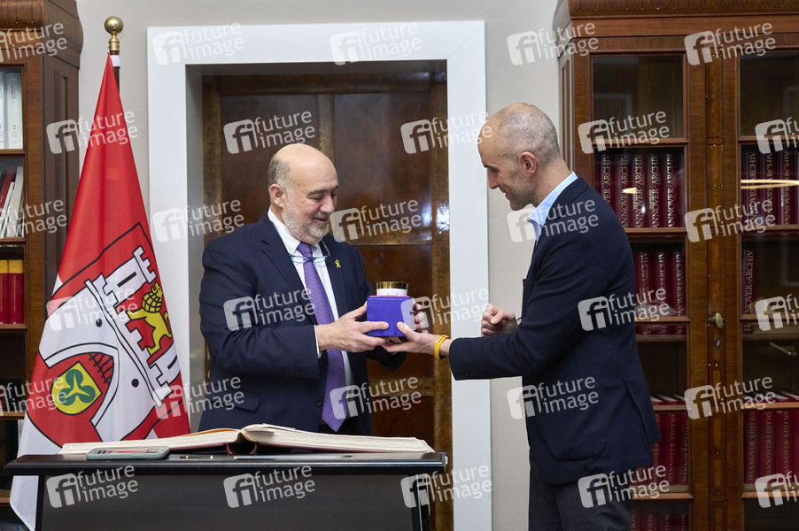 Belit Onay und Ron Prosor beim Eintrag des Botschafters von Israel in das Goldene Buch der Stadt Hannover im Neuen Rathaus. Hannover, 05.02.2024