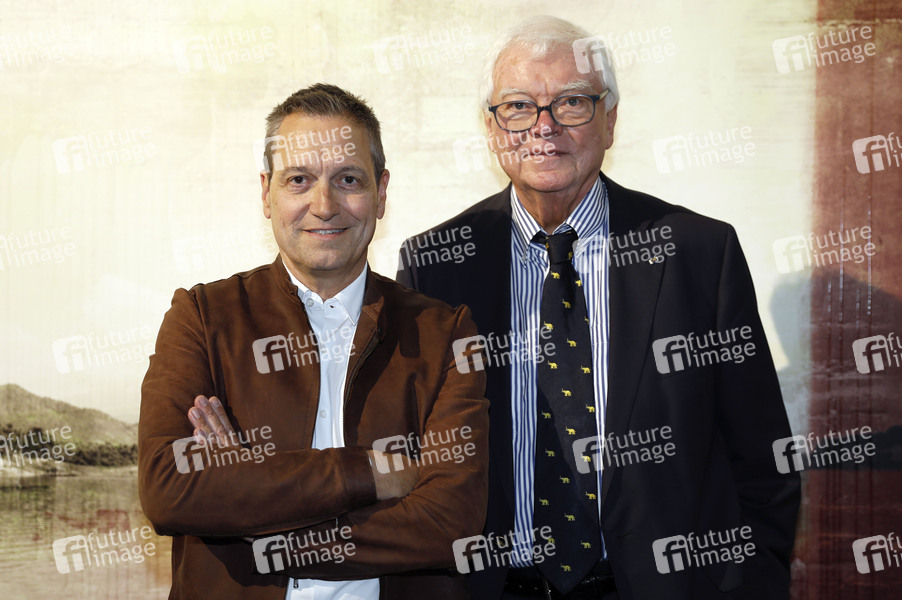 Dieter Nuhr und Bodo Hombach bei der Präsentation der Wanderausstellung 'Woanders ist überall' mit Gemälden über die Geschichte und Kultur des Ruhrgebiets von Dieter Nuhr in der Kreuzkirche. Essen, 28.05.2024
