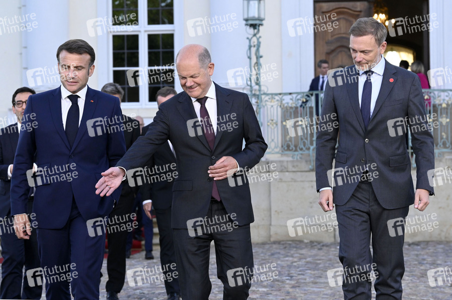 Emmanuel Macron, Olaf Scholz und Christian Lindner beim Treffen des Deutsch-Französischen Ministerrats im Gästehaus der Bundesregierung Schloss Meseberg. Meseberg, 28.05.2024