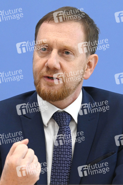 Michael Kretschmer bei der Bundespressekonferenz zur Entscheidung zur Gründung von zwei Großforschungszentren in der Lausitz und im mitteldeutschen Revier im Haus der Bundespressekonferenz. Berlin, 29.09.2022