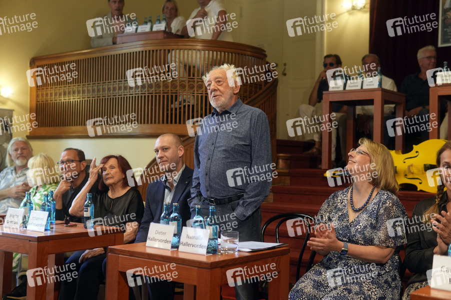 Frank Kessler, Dagmar Biener, Philip Tiedemann, Brigitte Grothum, Johannes Hallervorden, Dieter Hallervorden und Nathalie Hallervorden bei der Jahres-Pressekonferenz zur 16. Spielzeit 2024/2025 im Schlosspark Theater. Berlin, 03.09.2024