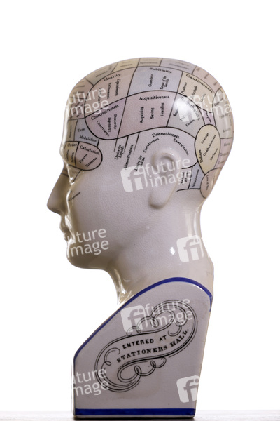 Anatomie, Schädel, Schädellehre, Phrenologie, Phrenology, Büste, Keramik, Kopf, phrenologisch, Physiognomie, Persönlichkeit, Charakter, Geist, Intelligenz, Gemüt, Fähigkeiten, geborene Verbrecher, Homo delinquens, Gehirn, Hirn, Pseudowissenschaft, Physiologie, veraltete Wissenschaften, Wissenschaft, überholte Ansichten, Schädelkunde, Materialismus, Weltbild, Äußeres, äußere Erscheinung, Esoterik, Schädeldeutung, Kopf, Kopfform, Schädelform, Symbolbild, Symbolfoto