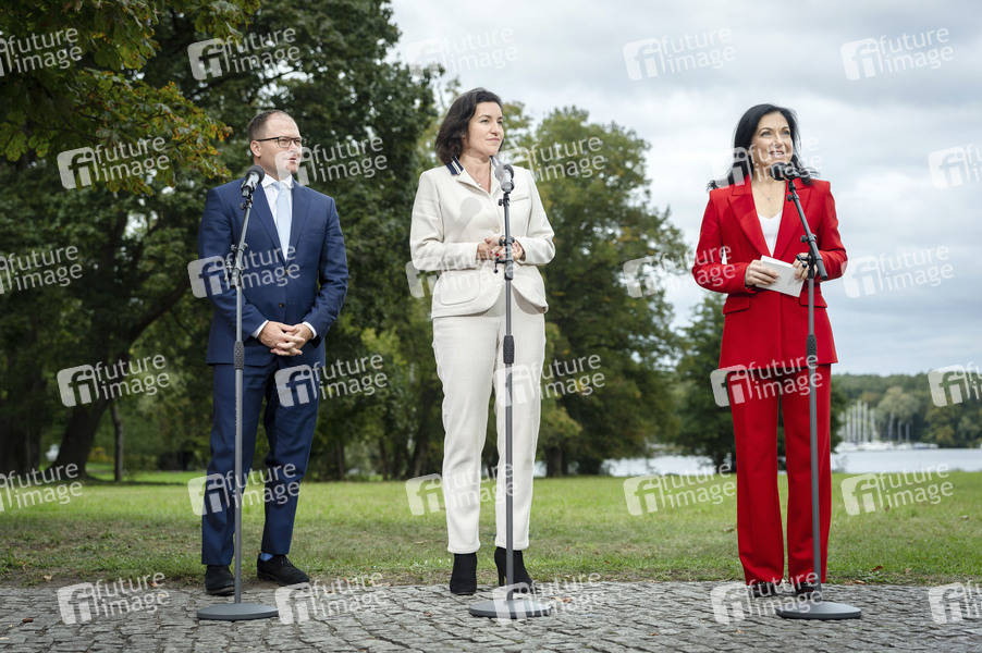 Carsten Schneider, Dorothee Bär und Katherina Reiche bei der Kabinettsklausur mit anschließender 17. Kabinettssitzung der Bundesregierung in der Borsig-Villa Reiherwerder. Berlin, 30.09.2025
