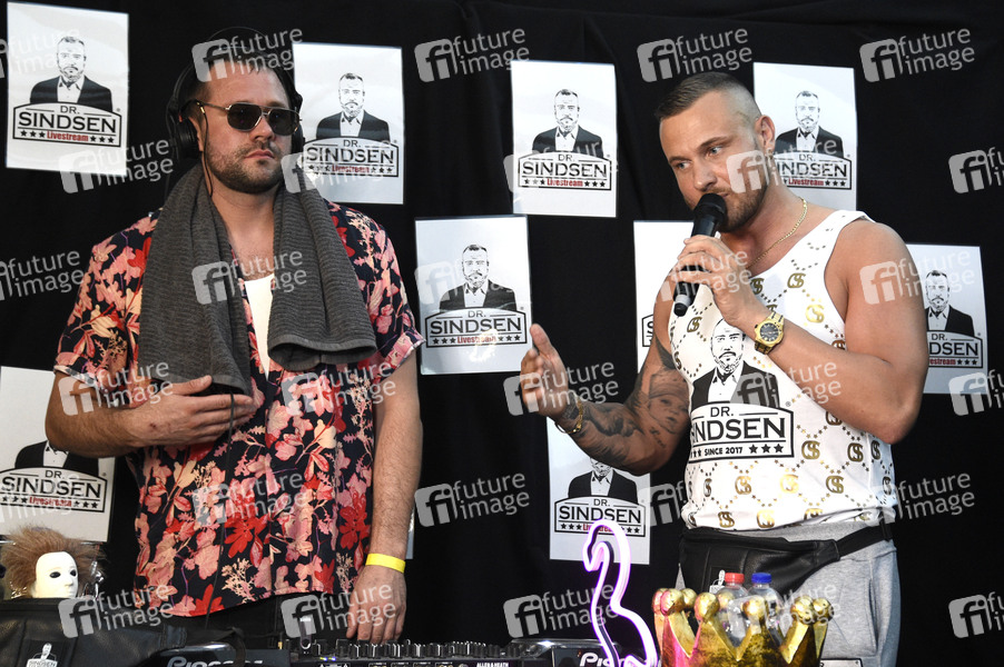 Grandmaster Sunshine und Eric Sindermann beim 'Dr. Sindsen Techno Livestream' unter dem Motte 'Wir setzen ein Zeichen! - Stoppt Mobbing' bei Dr. Sindsen. Berlin, 18.07.2020