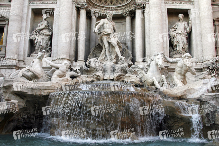 größter Brunnen Roms und einer der bekanntesten Brunnen der Welt, 26 Meter hoch, 50 Meter breit, eingeweiht 1735, besteht aus einer Palastfassade mit Triumphbogen, davor tummeln sich Meeresgestalten auf einer Felslandschaft, Fabelwesen des Meeres, Meerespferde, Tritonen, im Zentrum der herrschaftliche Meeresgott Oceanus