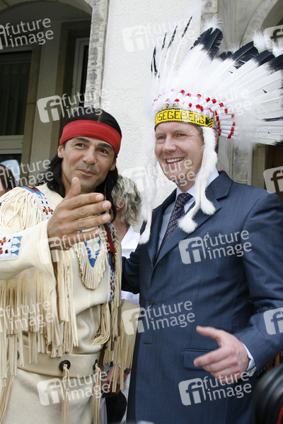Das Ensemble der Karl-May-Spiele 2009 nimmt Ministerpräsident Wulff in den Kreis der Ehrenhäuptlinge auf. Dazu fanden sich die Mitwirkenden von 'Der Schatz im Silbersee' in der Niedersächsischen Staatskanzlei in Hannover ein.