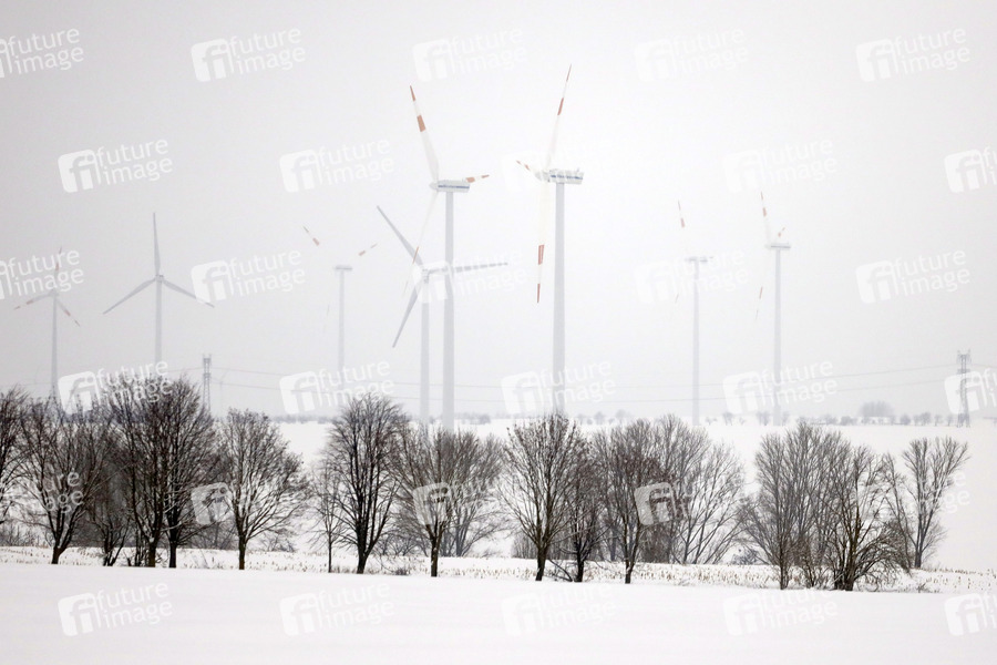 Windräder in einem Brandenburger Windpark stehen bei eisigen Temperaturen still in verschneiter Landschaft. Schnee und Eis machen den Windparks zu schaffen, in vielen Parks zeigten die Rotorblätter Eisansatz und konnten deshalb aus Sicherheitsgründen nicht angefahren werden. (Themenbild, Symbolbild) Berlin, 15.02.2021