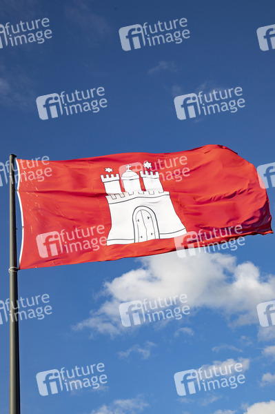 Aluminiummast, Bundesland, Bundesländer, Bundeslandflagge, Bundesrepublik Deutschland, Denkmalflagge, Edelstahlmast, Fahnenmast, Flaggen, Fahne, Kultur, Länderflagge, Landesflagge, Landesvertretung, Mitgliedland, Nationalflagge, Öffentlichkeit, Status, Wappen, Symbolbild, Symbolfoto, Rot, Weiß, Weiße Burg, Rotes Schild, Hoheitszeichen, Freie und Hansestadt Hamburg, mittelalterlicher Dom, Mariensterne