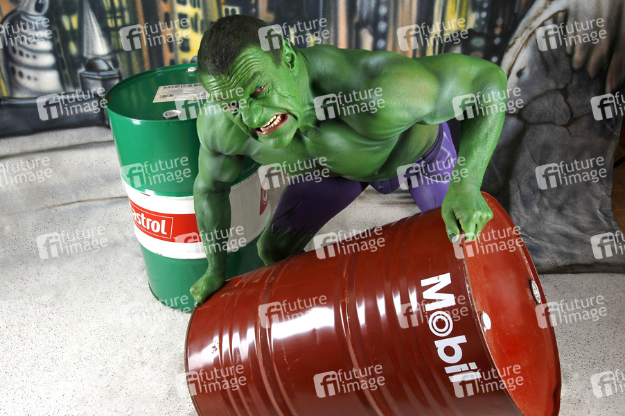Bodypainting, Body-Painting, Cosplay, Cosplayer, Körperkunst, Körperfarben, Farbe, Bemalung, Kunst, Malerei, Science Fiction, Sci-Fi, SciFi, Fantastic, Comic Art, Anime, Studio, Comic-Helden, Marvel, Superhelden-Fan, Comics, Superheld, Ölfass, body painting, body art, indoors, colors, superheroes, heroe, villain, oil barrel