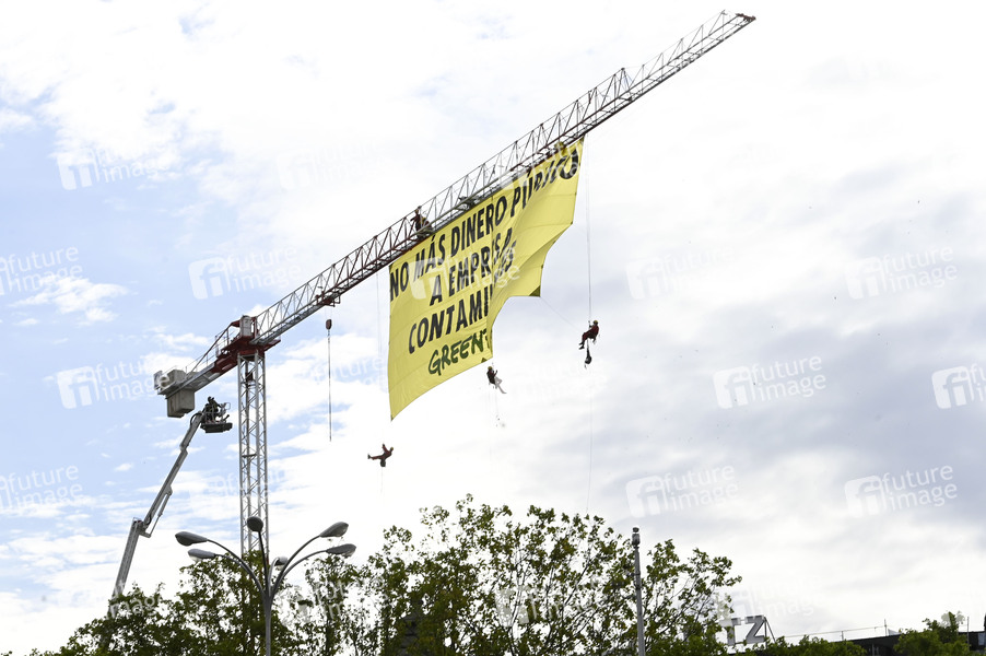Greenpeace-Aktivisten montieren ein Banner an einen Baukran um gegen die Unterstützung der Regierung für umweltverschmutzende Unternehmen zu protestieren. Madrid, 16.06.2020