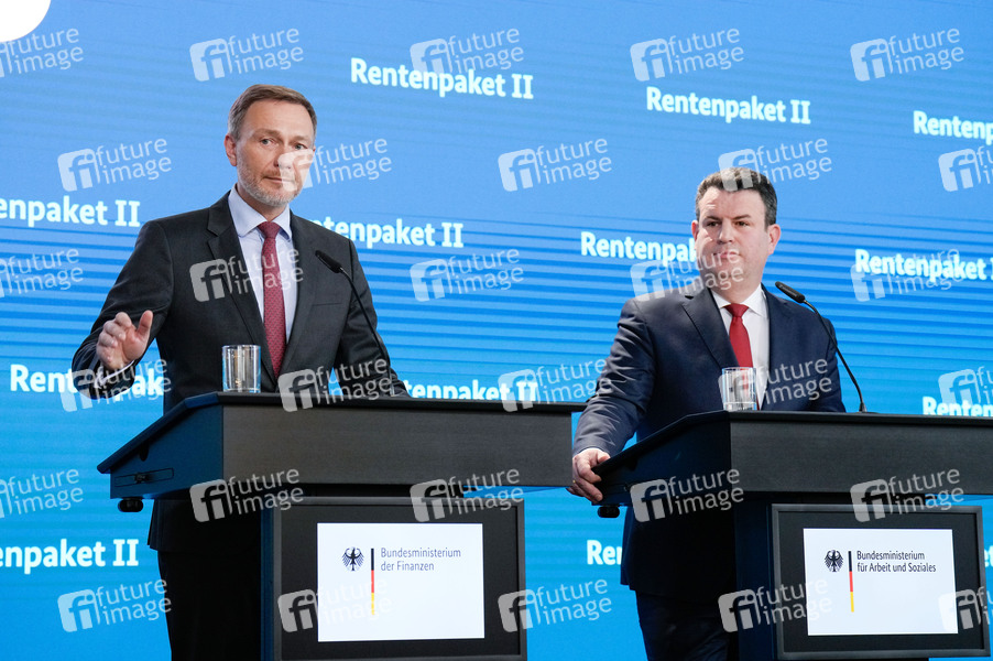 Christian Lindner und Hubertus Heil bei der Vorstellung des Rentenkonzepts der Bundesregierung Rentenpaket II im Bundesministerium für Arbeit und Soziales. Berlin, 05.03.2024
