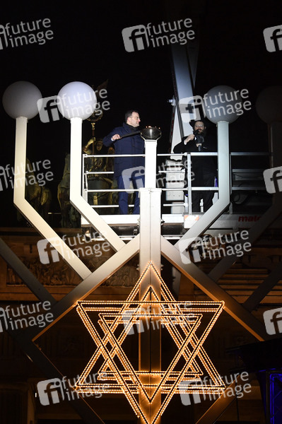 Jens Spahn und Rabbiner Yehuda Teichtal beim Zünden der ersten Kerze am Chanukka-Leuchter anlässlich der beginnenden Chanukka-Feiertage am Brandenburger Tor. Berlin, 10.12.2020
