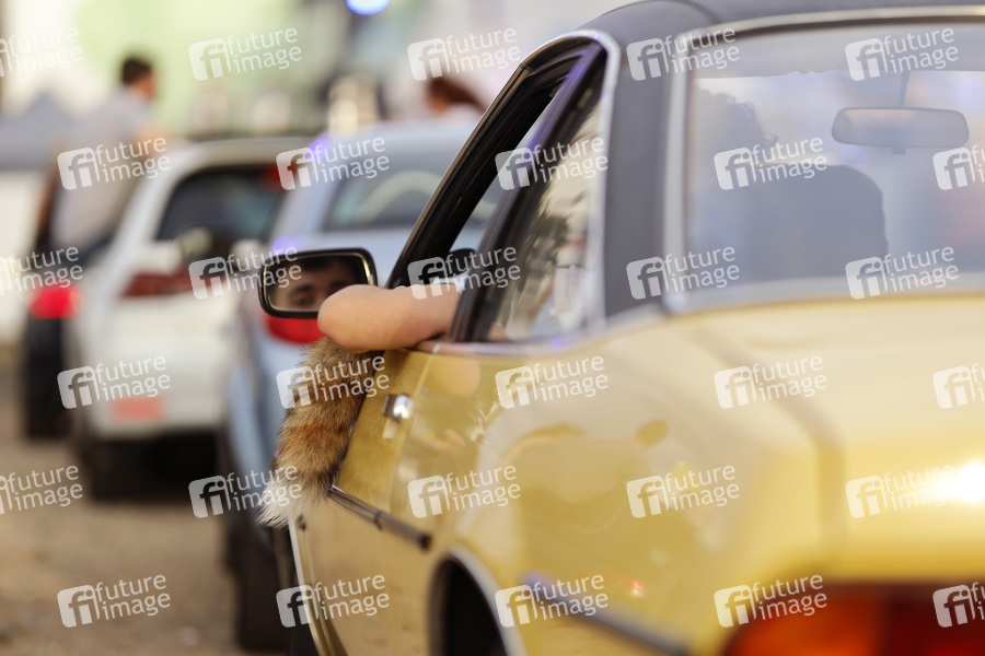 Ein Manta mit Fuchsschwanz und Ellenbogen aus dem Fenster im Autokino. Bonn, 27.06.2020