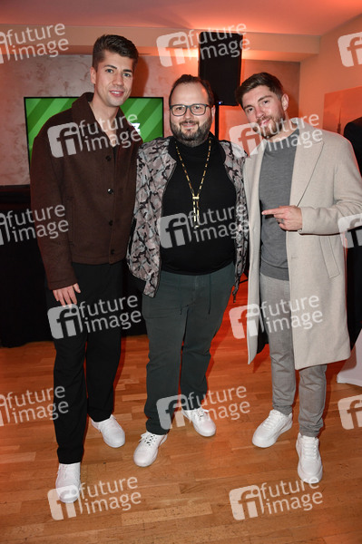 Maximilian Seitz, Gast und Joey Heindle bei der 4. Charity Promi Pack 2024 Aktion von Maximilian Seitz in der Mall of Berlin. Berlin, 27.11.2024