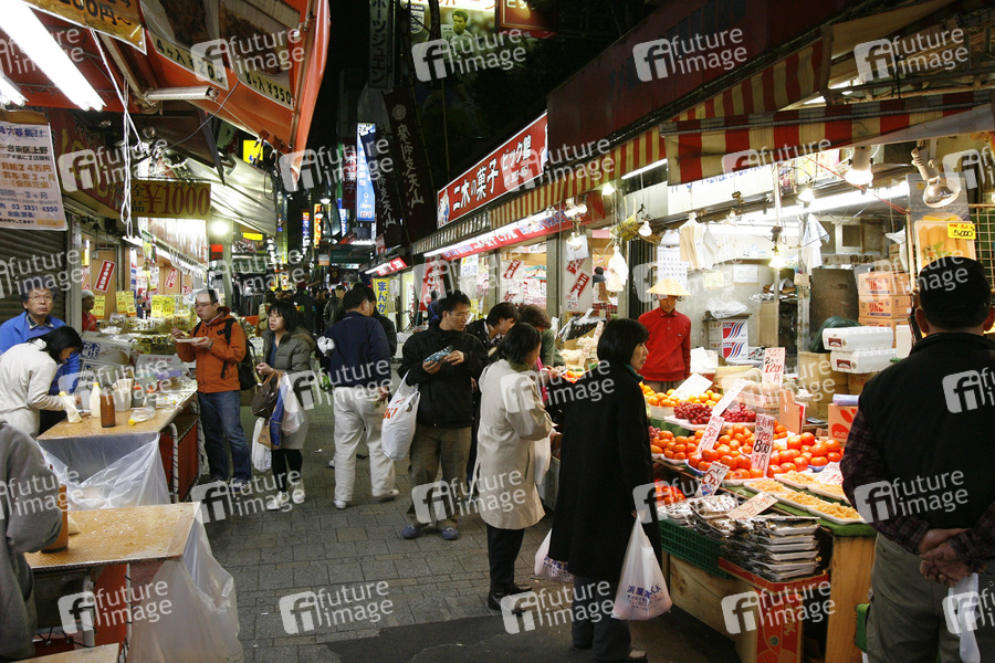 Geschäfte, Leuchtreklame, Werbung, Schilder, japanische Schriftzeichen, Passanten, Obst, Gemüse, Markt