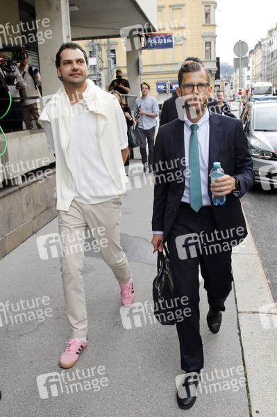 Jimi Blue Ochsenknecht mit seinem Anwalt Matthias Holzmann beim Verlassen des Gerichts nach dem Prozess wegen mutmaßlichen schweren Betrugs gegen Jimi Blue Ochsenknecht im Landesgericht Innsbruck. Innsbruck, 22.08.2025
