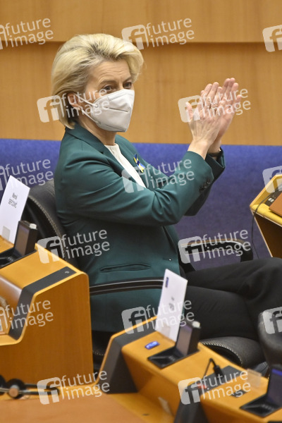 Rede, Politik, Europaparlament, EU-Parlament, EP, Parlament der Europäischen Union, Parlamentum Europaeum, MdEP, Mitglied des Europäischen Parlaments, Krieg, Angriffskrieg, Einmarsch, Europapolitik, internationale Krise, internationale Politik, internationales Recht, Konflikt, Krieg, Kriegsbeginn, Kriegsverbrechen, Krise, Militäroffensive, Militärschlag, Sanktionen, Solidarität, Solidaritätsbekundung, Ukraine, Ukrainekonflikt, Ukraine-Konflikt, Ukrainekrise, Ukraine-Russland-Krise, Politikerin, Deutschland, CDU, Präsidentin der Europäischen Kommission, EU-Präsidentin