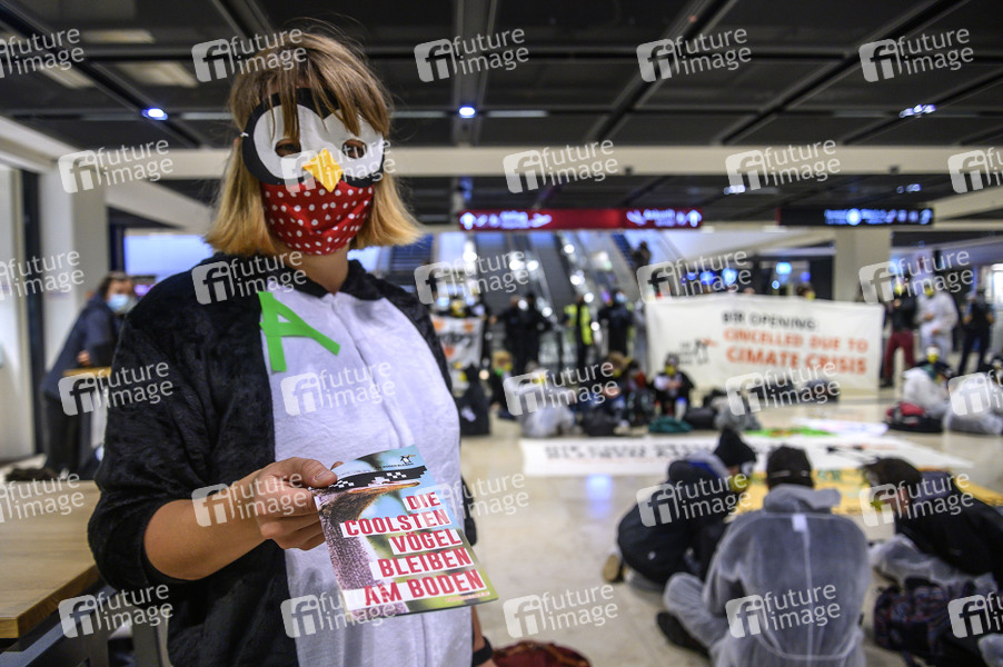 Klimaaktivisten der Aktionsgruppe 'Am Boden bleiben' protestieren gegen die Eröffnung des neuen Flughafens Berlin-Brandenburg. Der Protest richtet sich gegen die schlechte Klimabilanz des Fliegens. Schönefeld, 31.10.2020