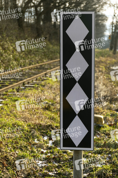 Signalordnung, Bahnbetrieb, Bahnübergang, Signal, Bahn, DB, Eisenbahn, rückstrahlende weiße Rauten, Eisenbahnsignal, Bahnübergangssicherungsanlagen, Geschwindigkeit, Streckenabschnitt, Eisenbahn-Signalordnung, ESO, Eisenbahnrecht, Bahnschienen, Schwellen, Schienen, Bahnverkehr, Bahngleis, Bahnkörper, Bahntechnik, Schienenverkehr, Symbolfoto, Themenfoto