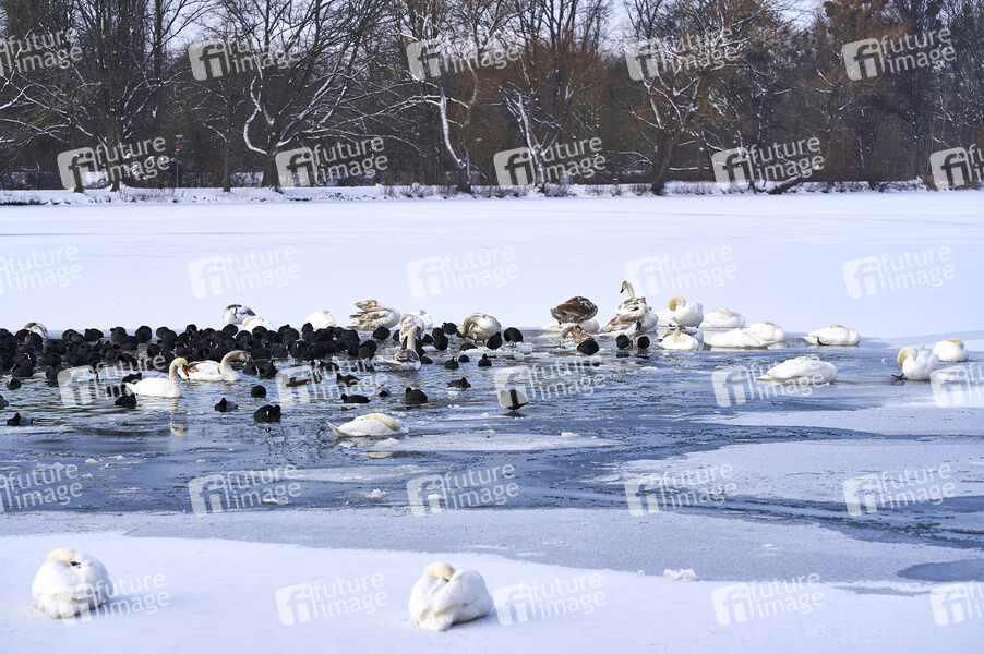 Schwäne und Vögel auf dem großteils zugefrorenen Maschsee. Hannover, 09.02.2021