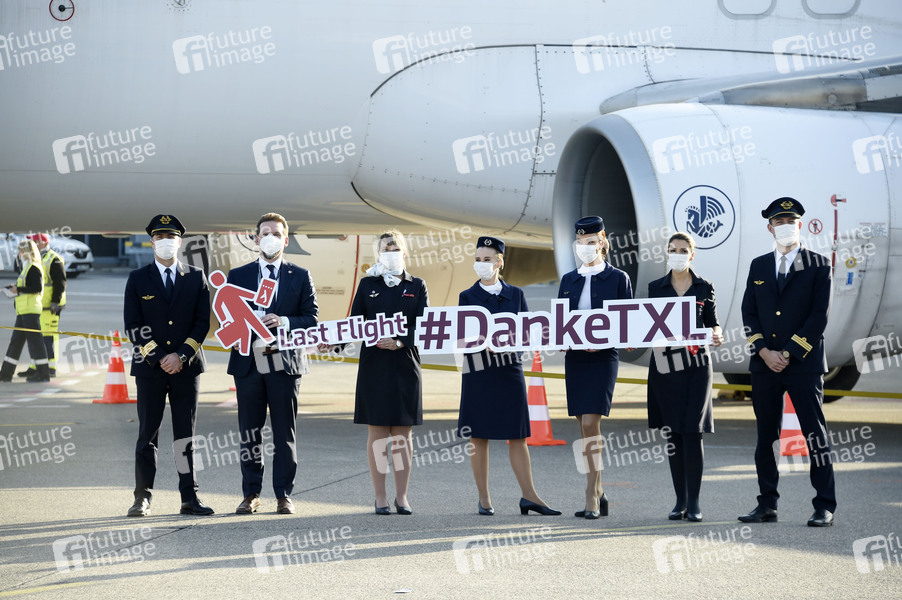 Die Crew des Air France Fluges. Mit der Inbetriebnahme des Flughafens Berlin Brandenburg Willy Brandt (BER) wird der gesamte Luftverkehr der Hauptstadtregion an einem Standort konzentriert. Der Flughafen Tegel, kurz TXL, schließt am 8. November. 60 Jahre nach dem ersten Linienflug von Air France wird am 8. November ein Flugzeug der französischen Airline zum allerletzten Mal von dem Flughafen im Nordosten Berlins starten und Adieu sagen. Berlin, 08.11.2020