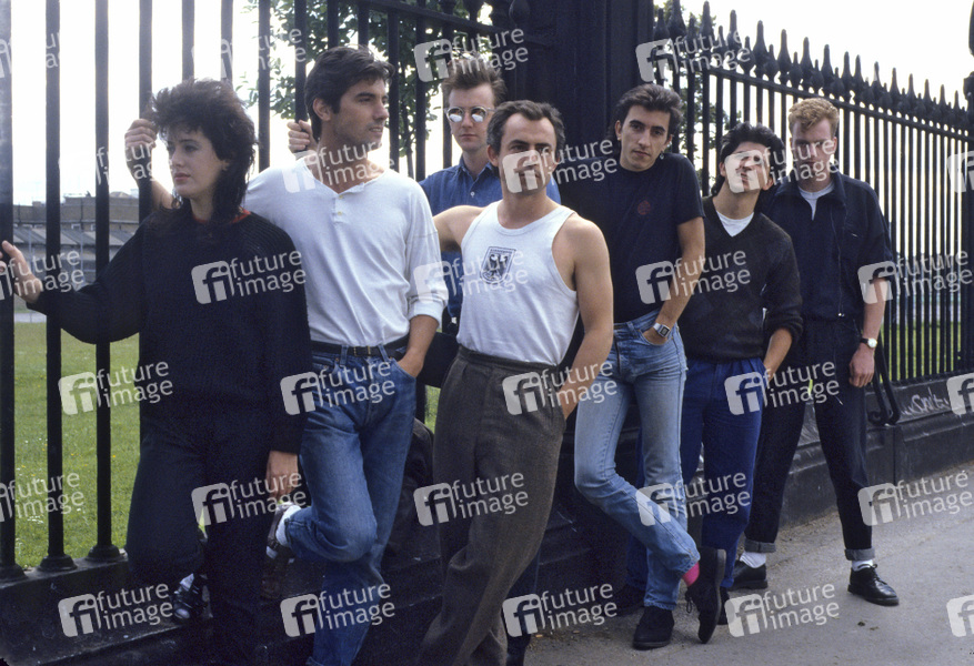 Terry Sharpe, Pat Gribben, Eileen Gribben, Gerard 'Spud' Murphy, Paul Crowder, Jonathan Whitehead und Tony Ayre von The Adventures bei einem Photoshooting. London, 15.07.1985