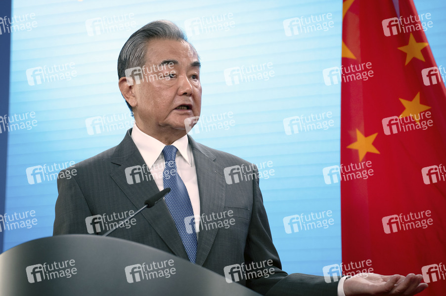 Wang Yi bei einer gemeinsamen Pressekonferenz des chinesischen Außenministers und des deutschen Außenministers im Auswärtigen Amt. Berlin, 03.07.2025