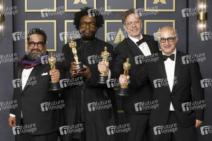 Joseph Patel, Ahmir 'Questlove' Thompson, David Dinerstein und Robert Fyvolent mit Oscars für den besten Dokumentarfilm 'Summer of Soul' im Press Room der Oscar Verleihung 2022 / 94th Annual Academy Awards im Hollywood & Highland Center. Los Angeles, 27.03.2022