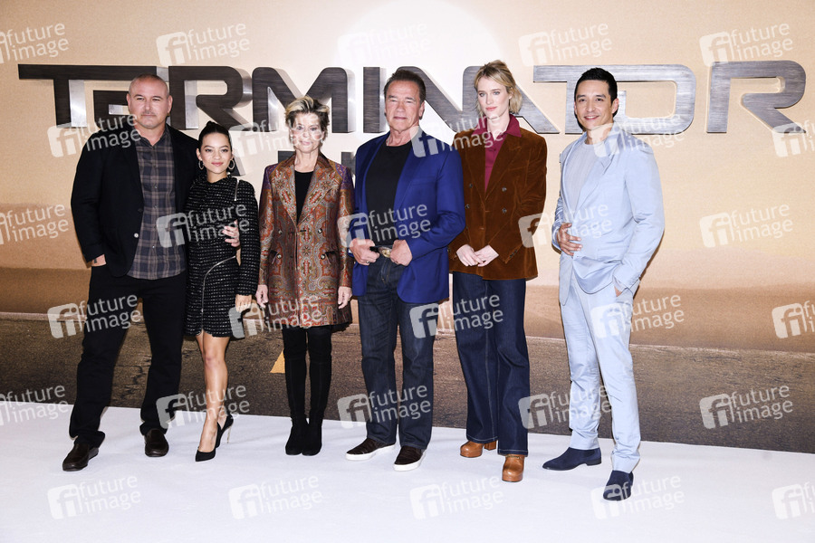 Tim Miller, Natalia Reyes, Linda Hamilton, Arnold Schwarzenegger, Mackenzie Davis und Gabriel Luna beim Photocall zum Kinofilm 'Terminator: Dark Fate' im Mandarin Oriental Hotel. London, 17.10.2019