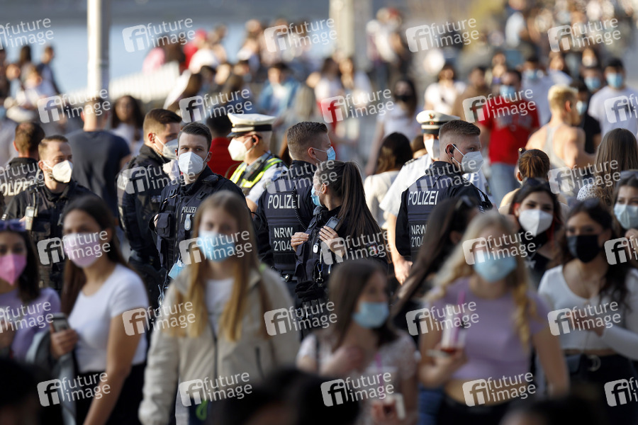 Polizei, Polizeikontrolle, Polizeidienst, Polizeistreife, Polizisten, Polizist, Polizistin, Polizeieinsatz, Beamte, Streife, Blaulicht, Polizeimaßnahme, Masken-Kontrolle, Maskenkontrolle, Verwarnung, Corona-Verstöße, Coronaverstöße, Corona-Verstoß, Coronaverstoß, Rheinboulevard, Kölner Rheinufer, Infektionsgeschehen, 7-Tage-Inzidenz, Abstand, Abstandsregeln, Ausgangsbeschränkung, Ausgangsbeschränkungen, Ausgangssperre, Ausgangssperren, Ausgangsverbot, Ausgangsverbote, Beschränkung, Bewegungsfreiheit, Corona, Coronaepidemie, Coronainfektion, Coronakontrolle, Corona-Kontrolle, Coronakrise, Corona-Krise, Coronamaßnahmen, Corona-Maßnahmen, Corona-Notbremse, Corona-Pandemie, Corona-Regeln, Corona-Schutz, Corona-Schutzmaßnahmen, Coronaschutzverordnung, Corona-Schutzverordnung, Corona-Test, Coronaviren, Corona-Viren, Coronavirus, Corona-Virus, Corona-Welle, Coronazahlen, Corona-Zahlen, Covid19, Covid-19, dritte Welle, Epidemie, erneuter Lockdown, Gesellschaft, Gesundheitsschutz, harter Lockdown, Hotspot, Hot Spot, Impfen, Impfverordnung, Infektionsgefahr, Infektionsschutzgesetz, Innenstadt, Inzidenzwert, Kontaktbeschränkungen, Lock Down, Lockdown, Lockdown Light, Maskenpflicht, Maßnahmen, Mindestabstand, Neuinfektionen, Notbremse, Oster-Lockdown, Pandemie, Pandemie-Gesetz, Passanten, R-Wert, Shopping, Sonnenlicht, Viren, Virus, Wocheninzidenz, zweite Welle, Infektionslage, Kontaktverbot, Versammlungsverbot, Menschenansammlung, Social Distancing