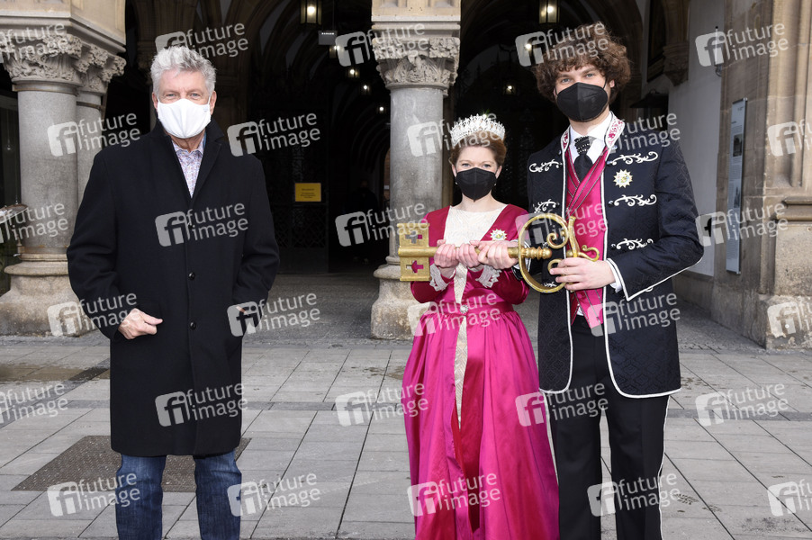 Dieter Reiter mit dem Faschingsprinzenpaar Berni I. (Berni Filser) und Margarethe I. (Margarethe Stadlbauer) mit dem Schlüssel der Stadt auf dem Rathausbalkon am Marienplatz. München, 08.01.2021