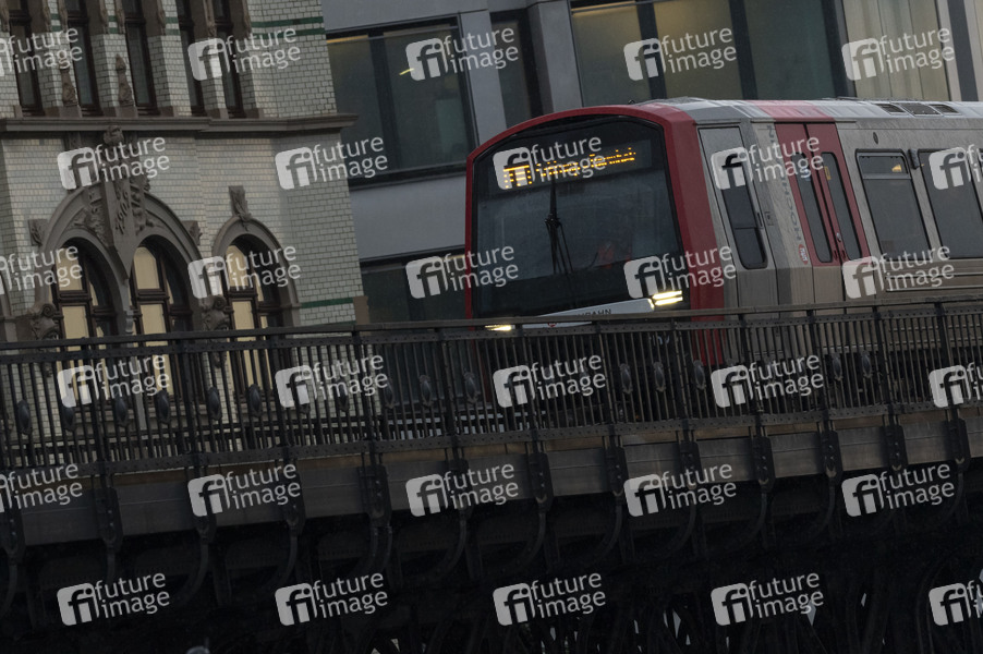 Starke Regenfälle und Gewitter sorgen diesen Sommer vermehrt für Unwetterwarnung: U-Bahn der Linie U3 unterwegs im Regen an den Landungsbrücken im Hafen. Hamburg, 14.08.2024