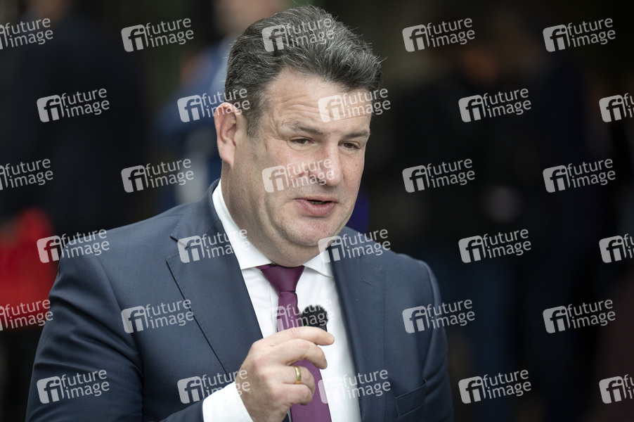 Hubertus Heil bei der Pressekonferenz von CDU, CSU und SPD zur Vorstellung des gemeinsamen Koalitionsvertrages im Paul-Löbe-Haus. Berlin, 09.04.2025