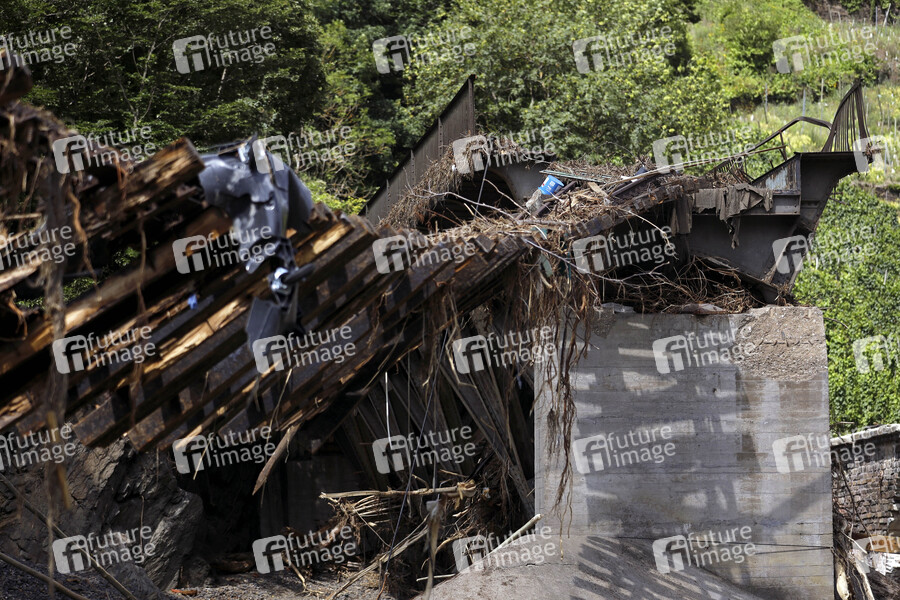 Nach dem Jahrhunderthochwasser in der Eifel durch heftige Regenfälle und Dauerregen mit Überschwemmungen und Überflutungen haben die Aufräumarbeiten im Ahrtal große Fortschritte gemacht. Einheiten von Polizei, THW, Bundeswehr und Feuerwehr mitsamt vielen freiwilligen Helfern haben Straßen geräumt, Schutt und Schlamm entfernt und die Menschen versorgt. Der Wiederaufbau wird trotzdem Jahre dauern. Im Bild Flutschäden an einer Eisenbahnbrücke nahe der Ortschaft Rech, in der die Flut viele Häuser zerstörte, 30.07.2021