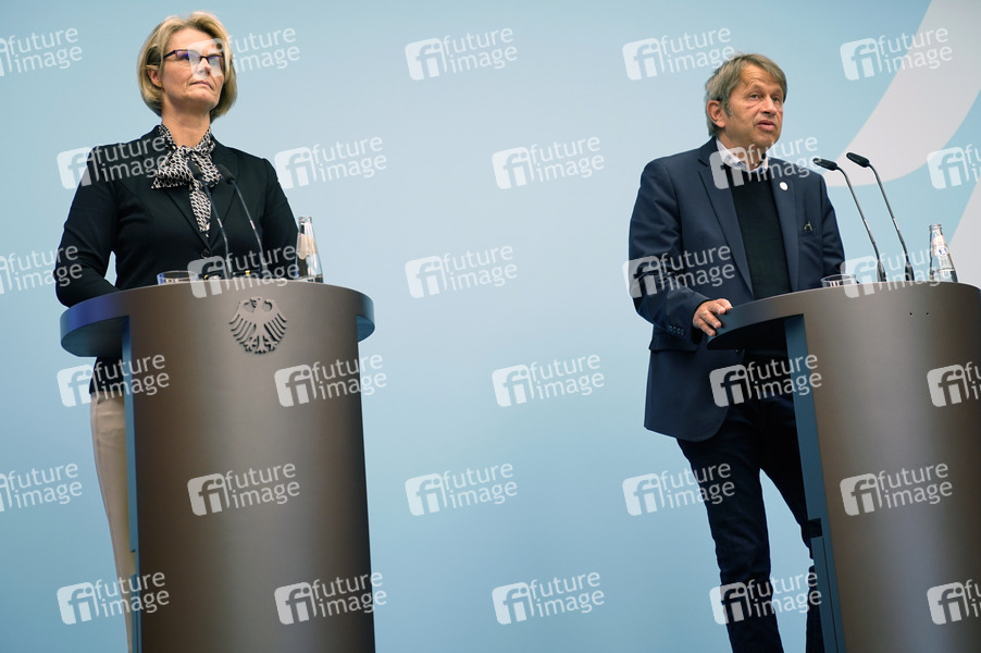 Anja Karliczek und Heyo K. Kroemer bei einer Pressekonferenz zum aktuellen Stand der Behandlung des Corona Virus Covid-19 und dem nationalen Netzwerk Universitätsmedizin im Bundesministerium für Bildung und Forschung. Berlin, 19.05.2020