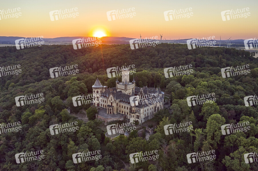 Sonnenuntergang am Schloss Marienburg auf dem Marienberg (Eine schriftliche Freigabe der Luftbilder durch die Pressesprecherin Annette Langhorst liegt vor). Nordstemmen, 13.08.2022