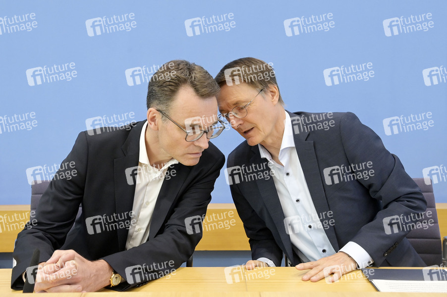 Stephan Baldus und Karl Lauterbach bei der Bundespressekonferenz Gesundes-Herz-Gesetz im Haus der Bundespressekonferenz. Berlin, 28.08.2024