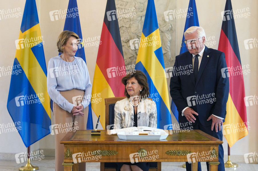 Elke Büdenbender, Königin Silvia von Schweden und Frank-Walter Steinmeier beim Empfang von Königin Silvia von Schweden und Eintrag in das Gästebuch im Schloss Bellevue. Berlin, 18.09.2024