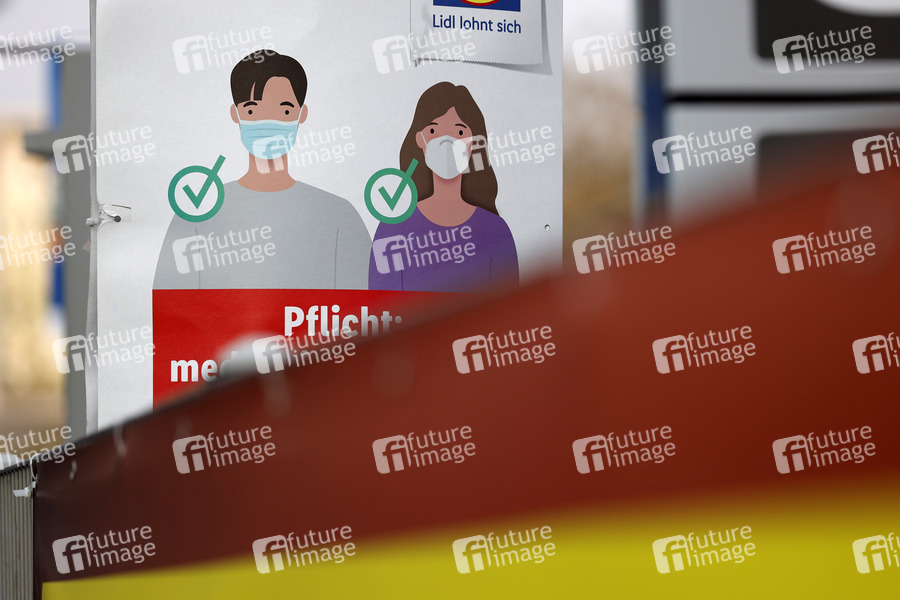 Einkaufen, Supermarkt, Supermärkte, Shopping, LIDL, LIDL-Markt, Coronaschutzverordnung, Maskenpflicht, Masken, Maske tragen, Mund-Nasen-Bedeckung, Mund-Nasen-Schutz, MNS, FFP2, medizinische Masken, Stoffmasken, Behelfsmasken, Corona, Virus, Coronavirus, Coronaviren, Schild, Hinweis, Hinweisschild, Corona-Maßnahmen, Corona-Politik, Coronamaßnahmen, Corona-Regeln, Coronaregeln, dritte Welle, zweite Welle, Kontaktbeschränkungen, Inzidenz, Inzidenzwert, Inzidenzwerte, Gesundheit, Hygiene, Neuinfektionen, R-Wert, Inzidenzzahl, Maskenzwang, Infektionsschutzgesetz, Infektionsschutz, 7-Tage-Inzidenz, Gesundheitspolitik, Zeitgeschichte, Corona-Auflagen, Lockdown, Lock Down, Solidarität, Symbolbild, Symbolfoto