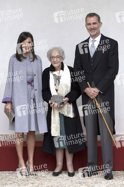 Königin Letizia von Spanien, Ida Vitale und König Felipe VI. von Spanien bei der Verleihung des Premio Miguel de Cervantes an Ida Vitale in der Universidad de Alcalá. Alcalá de Henares, 23.04.2019