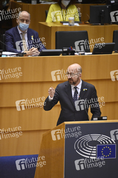 Charles Michel bei der Debatte über die Aggression Russlands gegen die Ukraine im Plenarsaal des Europäischen Parlaments. Brüssel, 01.03.2022