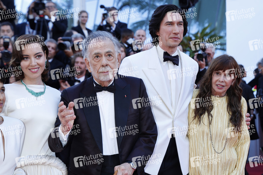 Aubrey Plaza, Francis Ford Coppola, Adam Driver und Talia Shire bei der Premiere des Kinofilms 'Megalopolis' auf dem Festival de Cannes 2024 / 77. Internationale Filmfestspiele von Cannes im Palais des Festivals. Cannes, 16.05.2024