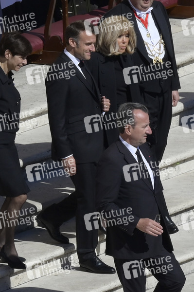 Emmanuel Macron mit Ehefrau Brigitte Macron bei der Trauermesse für den verstorbenen Papst Franziskus auf dem Petersplatz. Vatikanstadt, 26.04.2025
