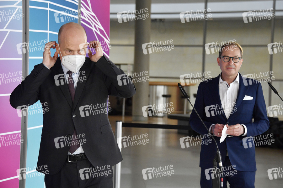 Ralph Brinkhaus und Alexander Dobrindt bei einem Pressestatement der CDU/CSU-Bundestagsfraktion vor der Fraktionssitzung auf der Fraktionsebene im Reichstagsgebäude. Berlin, 13.04.2021