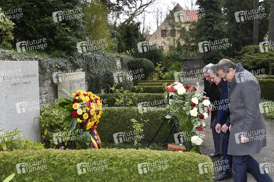 Ralf Wieland, Burkard Dregger und Michael Müller bei der Kranzniederlegung anlässlich des 100. Geburtstags des früheren Bundespräsidenten, Regierenden Bürgermeisters und Ehrenbürgers von Berlin, Richard von Weizsäcker an dessen Ehrengrab auf dem Waldfriedhof Dahlem. Berlin, 15.04.2020