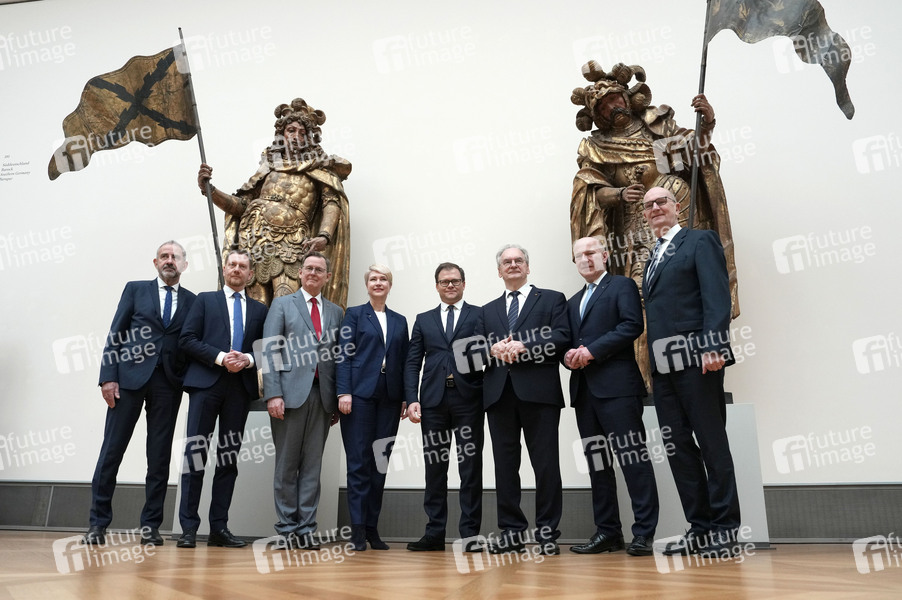 Hermann Parzinger, Michael Kretschmer, Bodo Ramelow, Manuela Schwesig, Carsten Schneider, Reiner Haseloff, Kai Wegner und Dietmar Woidke bei der Regionalkonferenz der Regierungschefin und der Regierungschefs der ostdeutschen Länder Berlin, Brandenburg, Mecklenburg-Vorpommern, Sachsen, Sachsen-Anhalt und Thüringen im Bodemuseum. Berlin, 29.02.2024