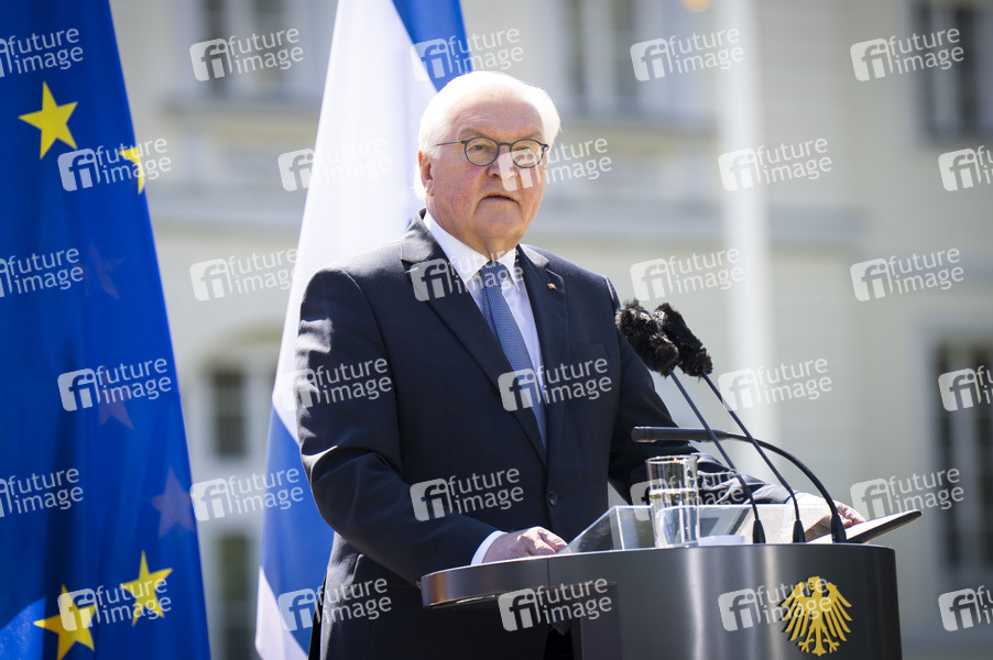 Frank-Walter Steinmeier bei einer gemeinsamen Pressekonferenz des Präsidenten des Staates Israel und des Bundespräsidenten im Schloss Bellevue. Berlin, 12.05.2025